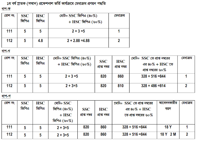 ক) আবেদনকারীদের SSC ও HSC পরীক্ষায় প্রাপ্ত জিপিএ এর ভিত্তিতে প্রতিটি কলেজের জন্য আলাদাভাবে কোর্সভিত্তিক মেধা তালিকা প্রণয়ন করে ১ম বর্ষ স্নাতক (সম্মান) প্রফেশনাল ভর্তি কার্যক্রমে কোর্স বরাদ্দ দেয়া হবে।